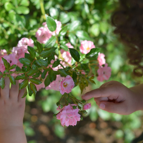 Dans la roseraie c'est l'occasion d'expliquer à Ilian qu'il y a différentes sortes de roses, avec chacunes ses spécificités, mais toutes des roses malgré tout. Et à Noah qu'elles sentent très bon, mais ont des épines... Il s'est pris de passion pour les petits panneaux nominatifs qu'il nous montrait systématiquement par la suite.