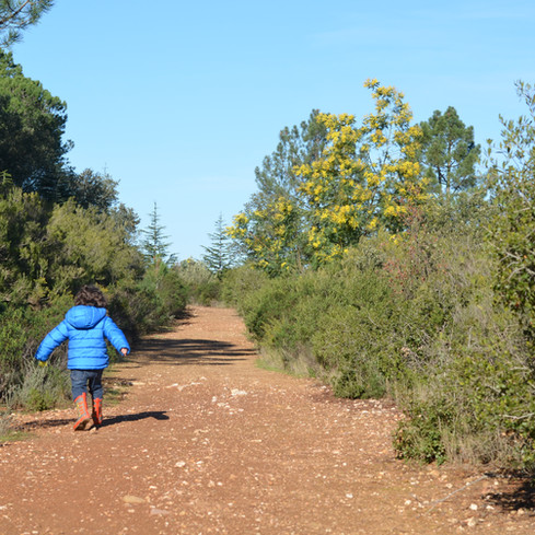 Nous aurions pu encore continuer longtemps la balade entre les mimosas avec une jolie vue sur la plaine, mais les petites jambes de Noah n'auraient pas trop aimé. D'ailleurs sur la fin, il a fallut ruser pour le faire avancer. C'est en jouant à cache cache derrière les buissons qu'il n'a pas vu les derniers mètres passer. Le Canigou lui aussi joue à se cacher aux aléas des virages du chemin.