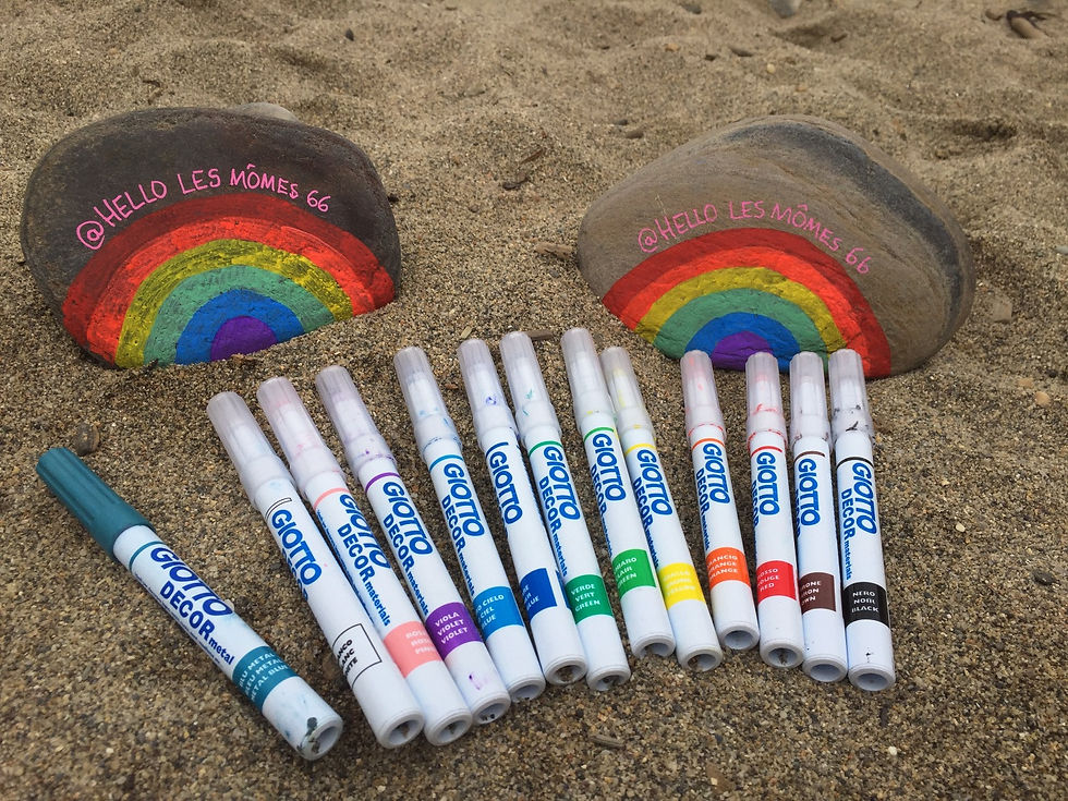 Ah ah vous allez me demander "qu'est ce que c'est??!"!! C'est parti d'une après-midi aux criques de Porteils, où nous avions amené notre trousse de feutres Posca et Giotto pour dessiner sur les galets comme nous l'avions déjà fait. Quelques petits dessins de mes loulous et moi, puis une envie de faire un arc-en-ciel sur un des galets!